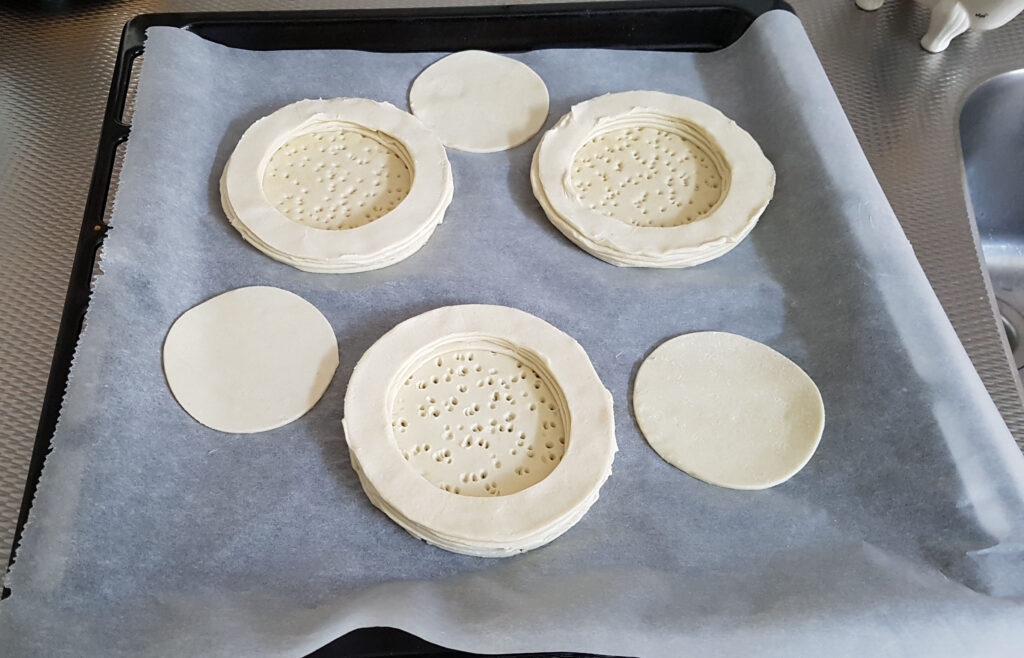 Nu gaan we de ringen uit steken. neem weer 3 plakken korst deeg, en leg ze op de houten snijplank. plaat weer de steek doos houder er op de rand en steek het deeg uit, haal voorzichtig het blik er af, plaats nu een kleinere ring er op maar let er op plm 8 mm verschil tussen de buiten rand en steek uit. Haal het overtollige deeg weg van je snij plank en zet het even weg. Met een kwastje in de ringen in smeren met een heel dun laagje met het los geslagen ei zorg dat je niet de randen raak, (anders rijst het niet meer als je ze afbak) Pak de nu het velletje beet en draai hem boven de deeg plak om, verwijder het plastic velletje. Ga zo door tot de korst plakken op zijn. enkel met de laatste plak deeg ook het midden gedeelte op de plaat leggen en af smeren met het los geklopte ei. Zo als op de foto